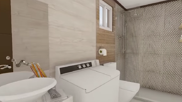 The bathroom is set up close to the kitchen. Despite its look to be slim and small, this bathroom has a washer, dryer, sink, and shower. This small room shows luxurious simply because of the elegant furniture.