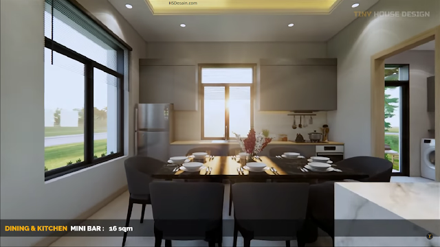Not far from the living area, there is a kitchen and dining area that is beautifully and minimally designed. In the dining area, using a modern dining table with rectangular shape and wood material combined with black arm chair for 6 people that makes the look more beautiful and modern. The kitchen area is also designed minimalist and simple by using a linear set.